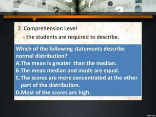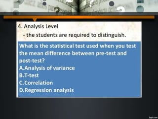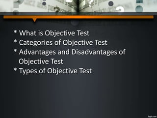 This document discusses objective tests, including what they are, their categories and types. Objective tests are those where the scoring rules do not allow for subjective judgments. They have selected and constructed response formats. Some common types are true/false, multiple choice, matching, fill-in-the-blank, and labeling. Objective tests are easier to score objectively but can only measure factual knowledge directly. They require careful construction to be effective.