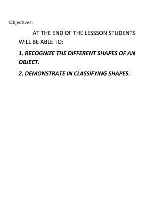 This lesson aims to help students recognize different shapes of objects and be able to classify shapes by demonstrating their knowledge of shapes. The key objectives are for students to be able to recognize various shapes and classify objects based on their shape.