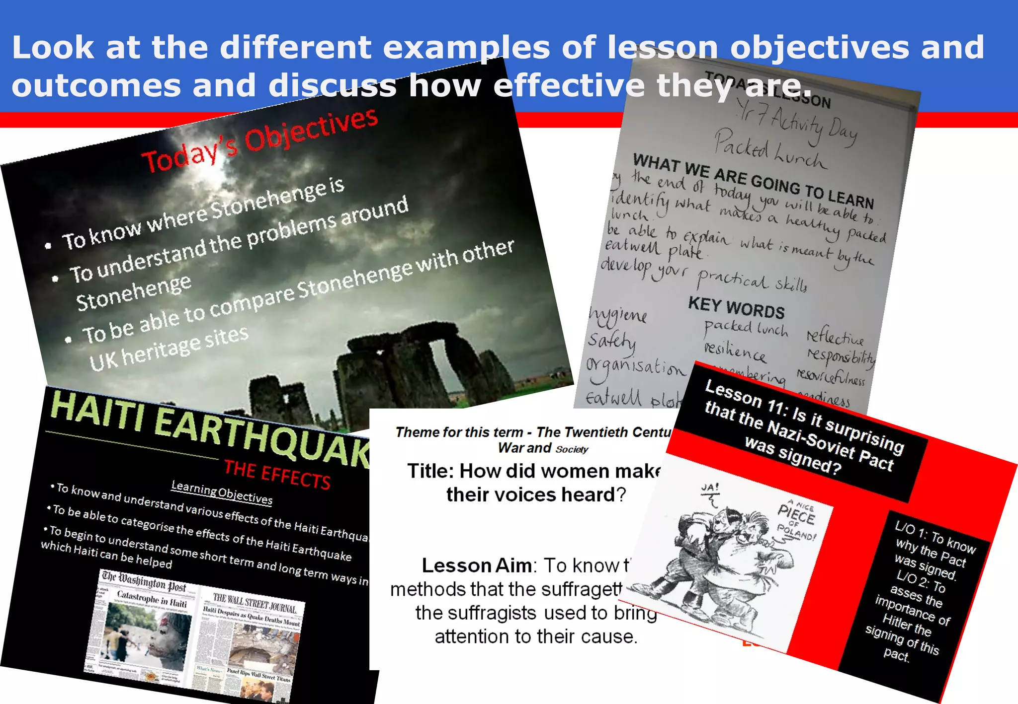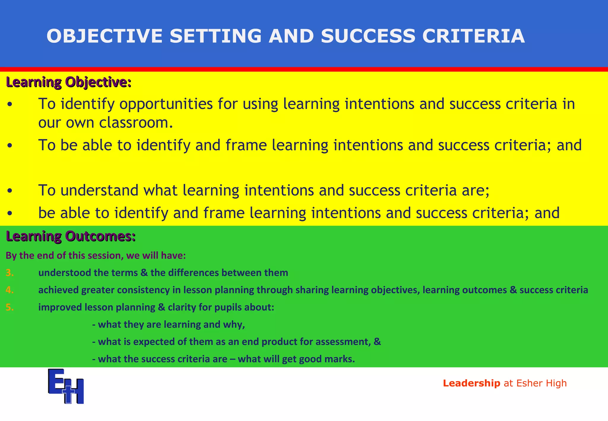 This document discusses the importance of using learning objectives, outcomes, and success criteria in lesson planning. It defines these terms and provides examples. Setting clear objectives helps pupils understand what they are learning and why. Describing outcomes and success criteria empowers pupils to take responsibility for their own learning and know how to be successful. When used consistently, these techniques can improve pupil focus, independence, understanding, and feedback.