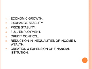 The objectives of monetary policy are: 1) economic growth through proper utilization of resources and increasing income and living standards, 2) exchange stability by adjusting exchange rates to achieve a favorable balance of payments, and 3) price stability to improve confidence and ensure equal distribution of income and wealth. Other objectives include attaining full employment, controlling credit, reducing income and wealth inequalities, and creating/expanding financial institutions to mobilize savings.
