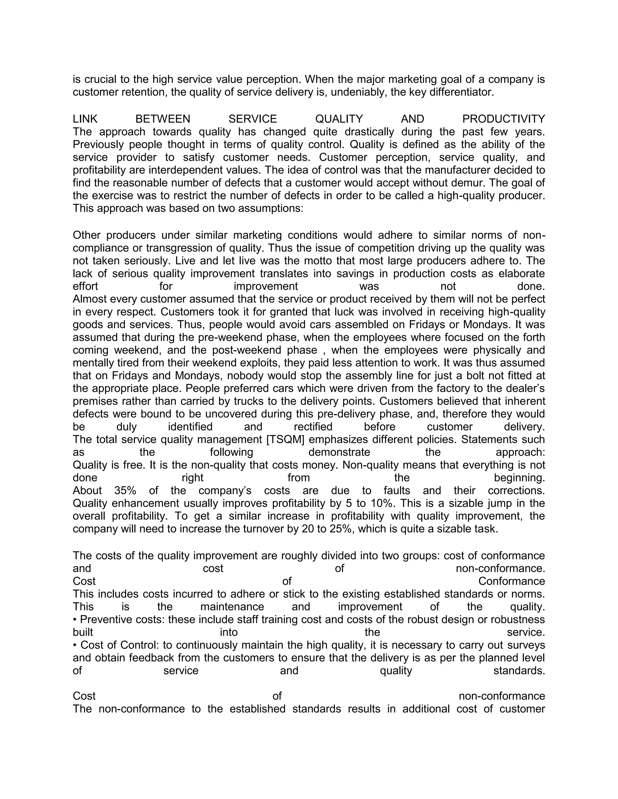 This document discusses several key aspects of defining and measuring service quality. It begins by outlining conceptual models that view service quality as having both technical and functional dimensions. It then describes five commonly used dimensions to evaluate service quality: reliability, responsiveness, assurance, empathy and tangibles. The document also discusses using SERVQUAL, a widely adopted instrument, to measure service quality by assessing the gap between customer expectations and perceptions. However, it notes there are some potential problems with solely relying on SERVQUAL scores to develop marketing plans.