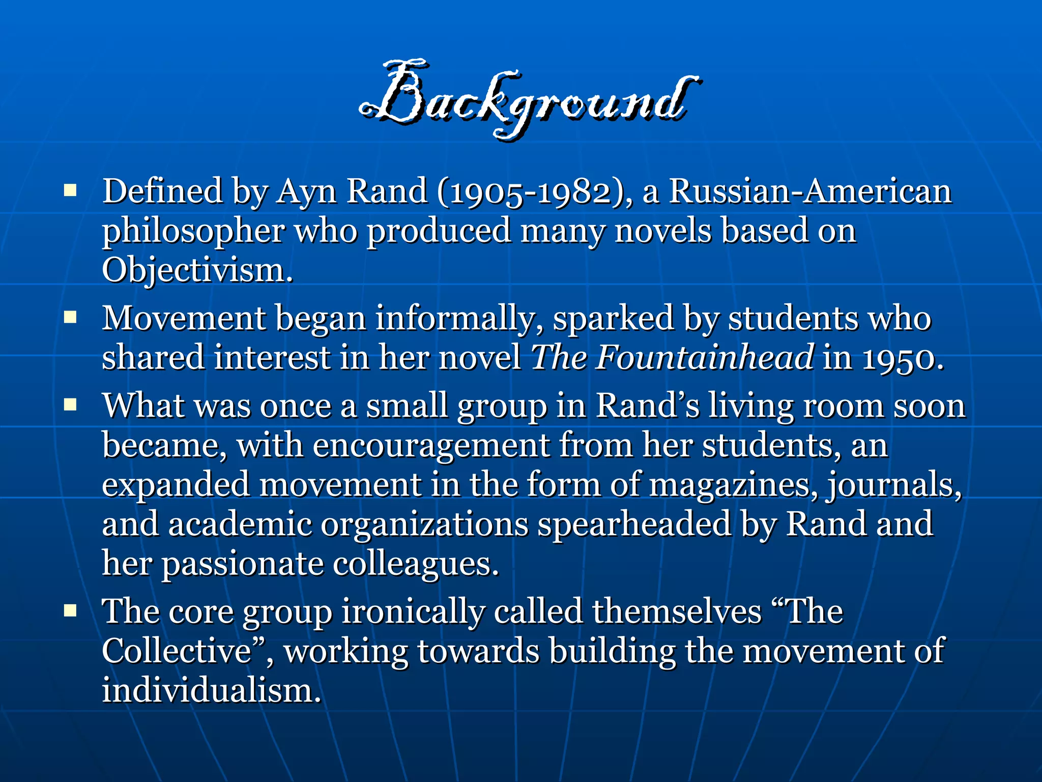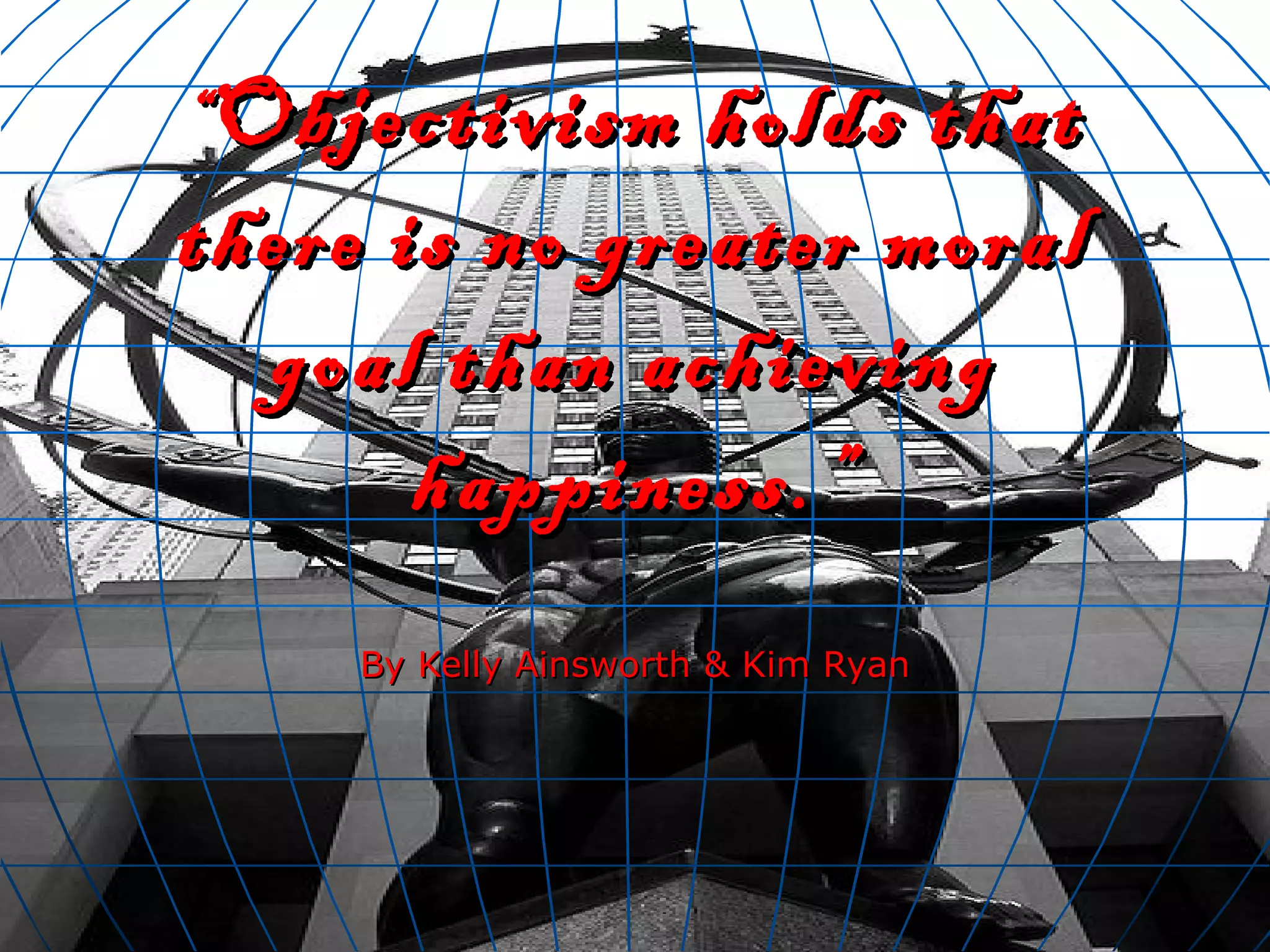 Objectivism holds that the greatest moral goal is individual happiness. It was founded by Ayn Rand and advocates rational individualism and laissez-faire capitalism. Objectivism believes that man must pursue happiness through respecting reality and not be a victim of forces beyond his control, and rejects ideas like altruism and collectivism.