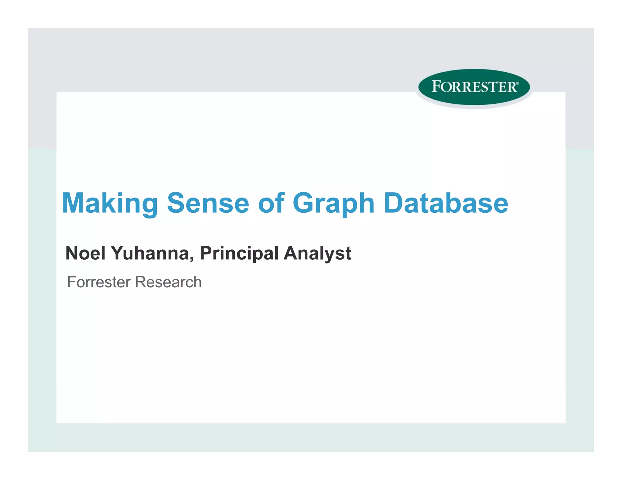 The document discusses graph databases and their advantages over traditional databases for modeling connected data. It provides an overview of graph databases and what they are used for. Key points include: