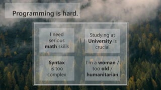 This document provides an overview of programming and object-oriented programming. It discusses that programming can be hard and require serious math skills, and some people may feel too old or that their gender or interests are barriers. However, it also outlines key concepts of object-oriented programming like objects, classes, inheritance, abstraction, polymorphism, and encapsulation. It encourages learning a language like C# and creating programs to gain experience.