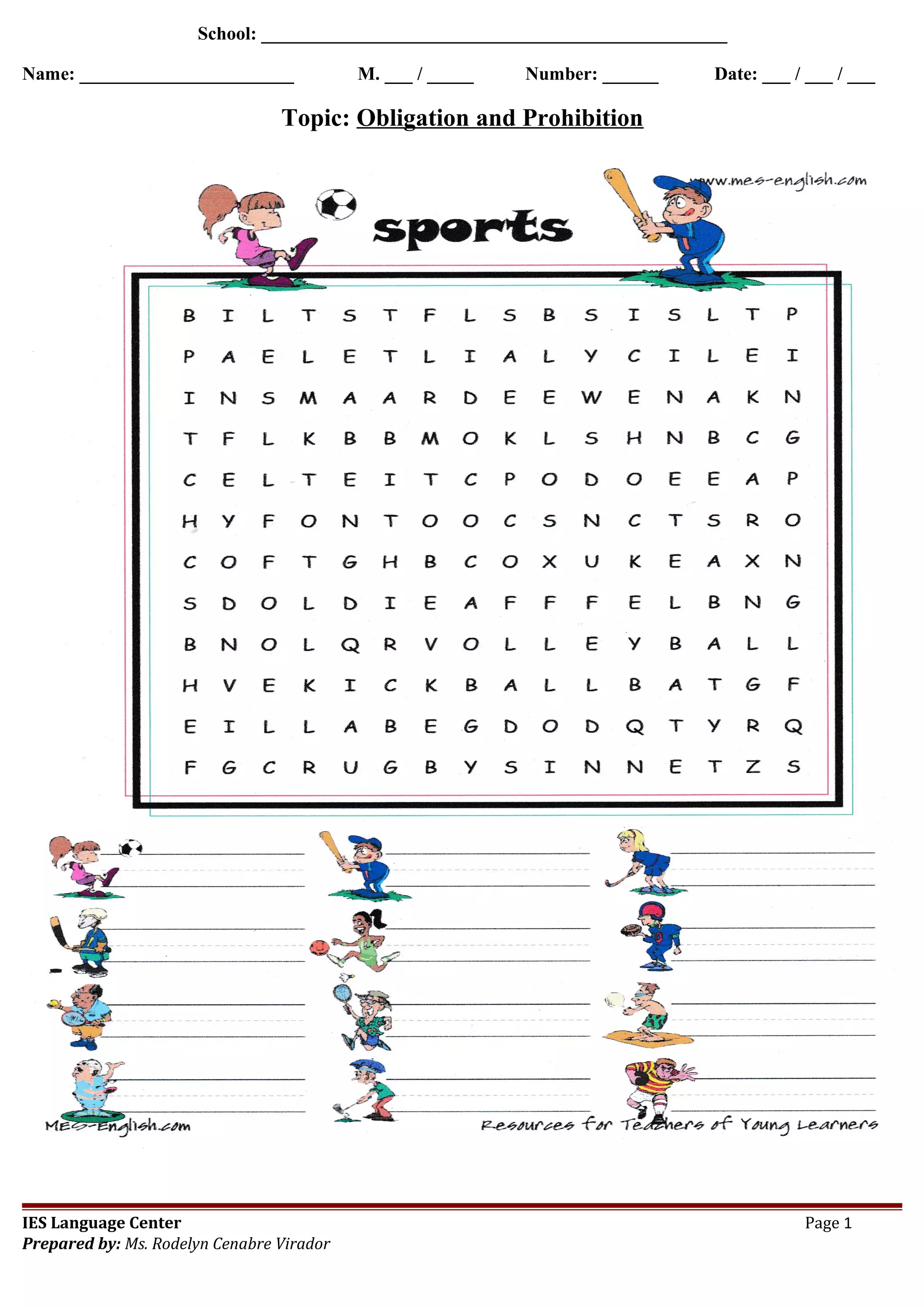 This document is a two-page form for a student attending an IES Language Center. It requests the student's school, name, identification number, and date. The topic of the form is listed as "Obligation and Prohibition" and was prepared by a Ms. Rodelyn Cenabre Virador.