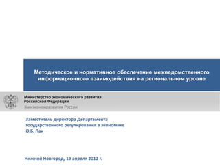Документ описывает методическое и нормативное обеспечение межведомственного информационного взаимодействия на региональном уровне в России, включая проектирование и предоставление государственных услуг. Упоминаются ключевые изменения в законодательстве для устранения правовых ограничений, а также текущие мероприятия и результаты мониторинга перехода к межведомственному взаимодействию. В документе также выделены задачи для субъектов России и перспективные направления развития системы взаимодействия.