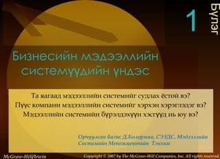Obrien13e chap001mn 1. 1- McGraw-Hill/Irwin Copyright © 2007 by The McGraw-Hill Companies, Inc. All rights reserved. Орчуулсан багш: Д.БОЛОРМАА, СЭЗДС. Мэдээллийн Системийн Менежментийн Тэнхим 2. Бизнесийн мэдээллийн системүүдийн үндэс Та яагаад мэдээллийн системийг судлах ёстой вэ? Пүүс компани мэдээллийн системийг хэрхэн хэрэглэдэг вэ ? Мэдээллийн системийн бүрэлдэхүүн хэсгүүд нь юу вэ ? Бүлэг 1 McGraw-Hill/Irwin Copyright © 2007 by The McGraw-Hill Companies, Inc. All rights reserved. Орчуулсан багш: Д.Болормаа, СЭЗДС. Мэдээллийн Системийн Менежментийн Тэнхим 3. Хичээлийн зорилго Систем ба мэдээллийн системийн тухай ойлголт Бизнесийн мэргэжлийн хүмүүст мэдээллийн системийн мэдлэг яагаад чухал вэ? Бизнесийн мэргэжилтнүүдэд хэрэгтэй мэдээллийн системийн мэдлэгийн таван хүрээ Мэдээллийн системүүд пүүс компанийн бизнес процесс, удирдлагын шийдвэр гаргалт, өрсөлдөх давуу байдлыг олгох стратегиудыг дэмжих нь 1- 4. Хичээлийн зорилго Бодит бизнесийн байгууллагууд дээрх мэдээллийн системийн үндсэн төрлүүдийн жишээ Мэдээллийн технологийн амжилттай, ёс суртахуунтай хөгжүүлэлт ба хэрэглээг удирдах үед бизнесийн менежерт тулгарч болох сорилтууд 1- 5. Хичээлийн зорилго Бодит амьдрал дээрх мэдээллийн системүүдийн бүрэлдхүүн хэсгүүдийн жишээнүүд. Өгөгдөл, мэдээний нөөцүүдийг мэдээллийн бүтээгдхүүн болгон хувиргадаг оруулах, боловсруулах, хадгалах, хянах ажлуудыг гүйцэтгэхэд хүмүүс, техник хангамж, програм хангамж, мэдээ, өгөгдөл ба сүлжээний нөөцүүдийг хэрэглэх нь Мэдээллийн системийн ажлын байрны боломжууд 1- 6. Мэдээллийн систем ба мэдээллийн технологийг яагаад судлах хэрэгтэй вэ ? Амжилттай пүүс компанийн амин чухал бүрэлдхүүн хэсэг Пүүс компанид өргөжих, өрсөлдөхөд нь тусална Пүүс компаниуд МС ба МТ-ийг Бизнес процессийн үр ашиг, үр өгөөжийг Удирдлагын шийдвэр гаргалтыг Ажлын хэсгүүдийн хамтын ажиллагааг сайжруулахын тулд хэрэглэж байна. 1- 7. Систем гэж юу вэ ? Систем бол Нийтлэг зорилтуудад хүрэхийн төлөө хамтдаа ажиллаж байгаа Маш тодорхой тогтоосон хил хязгаартай Өөр хоорондоо уялдаа холбоотой цогц бүрэлдхүүн хэсгүүд 1- 8. Мэдээллийн систем гэж юу вэ ? Байгууллага доторх мэдээллийг хадгалж, эргүүлэн олж авч, хувирган боловсруулж, тарааж түгээдэг Хүмүүс Техник хангамж Програм хангамж Харилцаа холбооны сүлжээнүүд Өгөгдөл, мэдээний нөөцүүд Бодлого ба дүрэм журмуудын зохион байгуулагдсан иж бүрдэл 1- 9. Мэдээллийн систем ( МС ) ба Мэдээллийн Технологийн ( МТ ) -ийн ялгаа МС - байгууллага руу мэдээлэл ба үйл ажиллагаануудыг дамжуулж, хүргэхэд шаардлагатай бүх бүрэлдхүүн хэсгүүд ба нөөцүүд МТ - техник хангамж, програм хангамж, сүлжээ ба өгөгдөл, мэдээллийн удирдлага Онолоор бол МС нь цаасанд суурилсан байж болно Харин бид Компьютерт суурилсан Мэдээллийн Системийг ( КСМС ) судлах болно 1- 10. 11. Бизнесийн мэргэжлийн хүмүүс МС-ийн талаар юу мэдэж байх шаардлагатай вэ ? Суурь ойлголтууд : зан төлөв, техник, бизнес ба удирдлагын суурь ойлголтууд Мэдээллийн Технологи : Техник хангамж, програм хангамж, сүлжээ, өгөгдлийн удирдлага ба Интернетэд суурилсан технологи Бизнесийн хэрэглээнүүд : Байгууллага доторх МС-ийн үндсэн хэрэглээнүүд Хөгжүүлэх процесс : Бизнесийн боломжуудыг хангахын тулд МС-ийг хэрхэн төлөвлөж, хөгжүүлж, нэвтрүүлэх арга, процесс Удирдлагын сорилтууд : МТ-ийг үр ашигтай, ёс суртхуунтайгаар удирдахад тулгардаг сорилтууд 1- 12. МС пүүс компанид ямар үүрэг гүйцэтгэдэг вэ? 1- Бизнес процесс, үйл ажиллагааг дэмжи