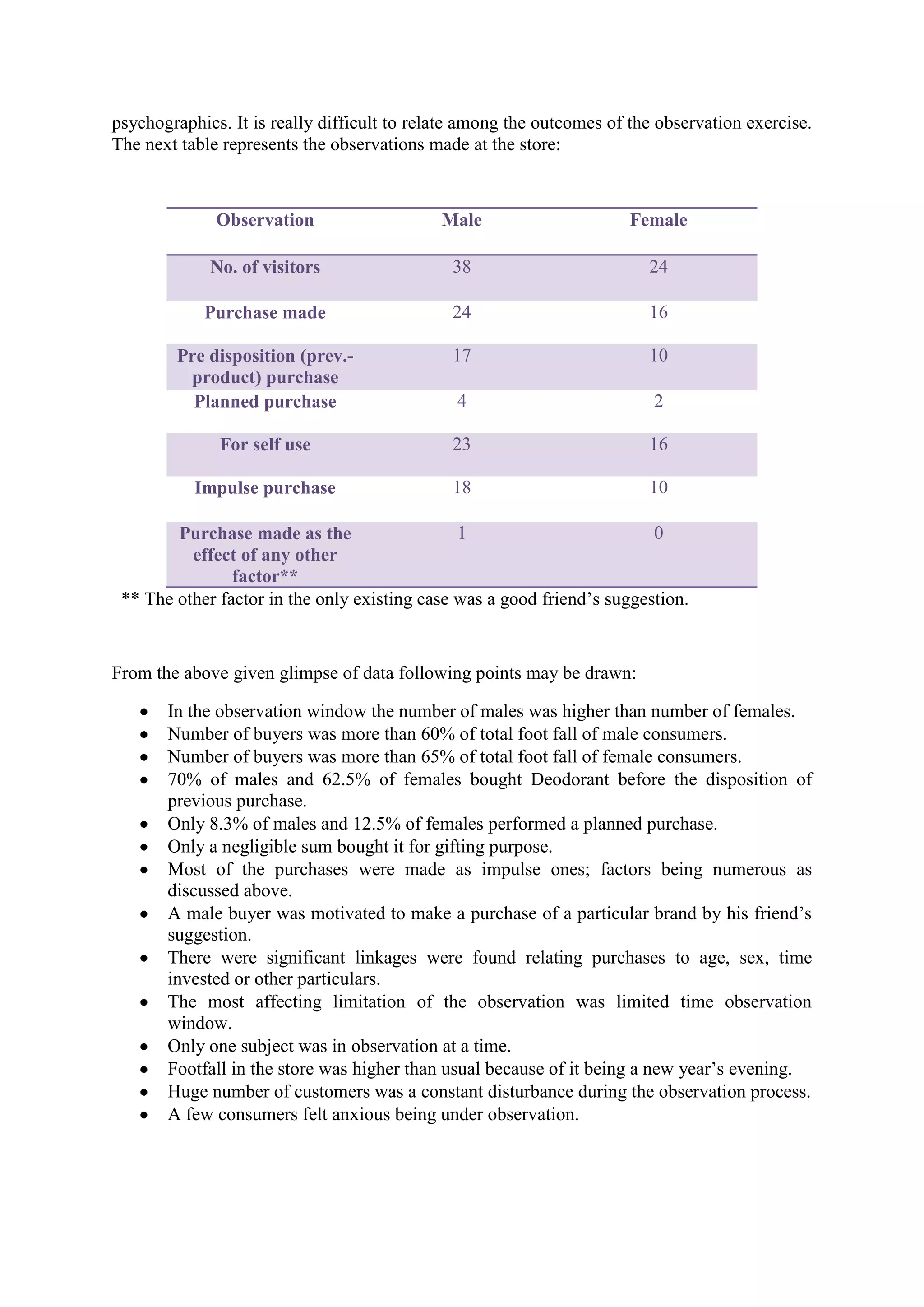 The document summarizes observations from a study on consumer buying behaviour of perfumes and deodorants. The study was conducted by silently observing customers in the perfume and deodorant section of a retail store. Most customers were between 20-40 years old and purchases were made mostly by males and females in equal numbers. The observations found that while some purchases were planned, most were impulsive. Customers spent time looking at multiple brands across different price points before deciding. The most important factors for customers were quality and price, with quality being more important. The study had limitations due to a short observation window, observing customers one at a time, and disturbances from the number of customers in the store during observations.