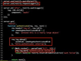 This document discusses making Node.js applications more observable at scale. It describes using tools like Bunyan for structured logging, Restify for building observable REST applications, and Unix tools for querying logs. Observability is important for production systems to detect errors, latency issues, and memory leaks. The presenter advocates building observability into applications from the start through techniques like scoped child loggers and request capture streams.