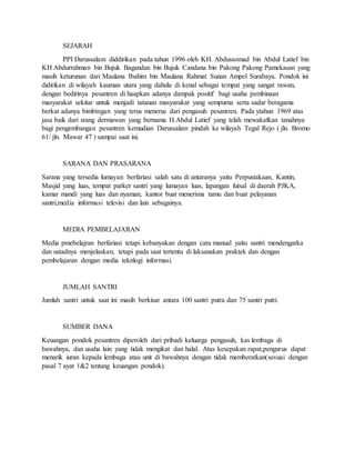 PPI Darussalam didirikan pada tahun 1996 untuk membantu pembinaan masyarakat sekitar. Pondok ini memiliki sarana seperti perpustakaan, masjid, dan fasilitas lain. Metode pembelajarannya meliputi ceram keagamaan secara langsung maupun menggunakan teknologi. Jumlah santrinya sekitar 100 siswa putra dan 75 siswa putri. Dana operasional berasal dari sumbangan keluarga pengasuh dan unit terkait