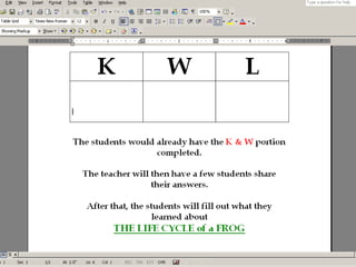 The document discusses a teacher reviewing frog life cycles with students for an upcoming test. It outlines the stages of a frog's life cycle, including the egg, tadpole, froglet, and adult stages. For each stage, it prompts the teacher to ask questions and students to provide key details, such as eggs being laid in water and tadpoles developing legs as they transition to the third stage. The review confirms students are now experts on the full frog life cycle.