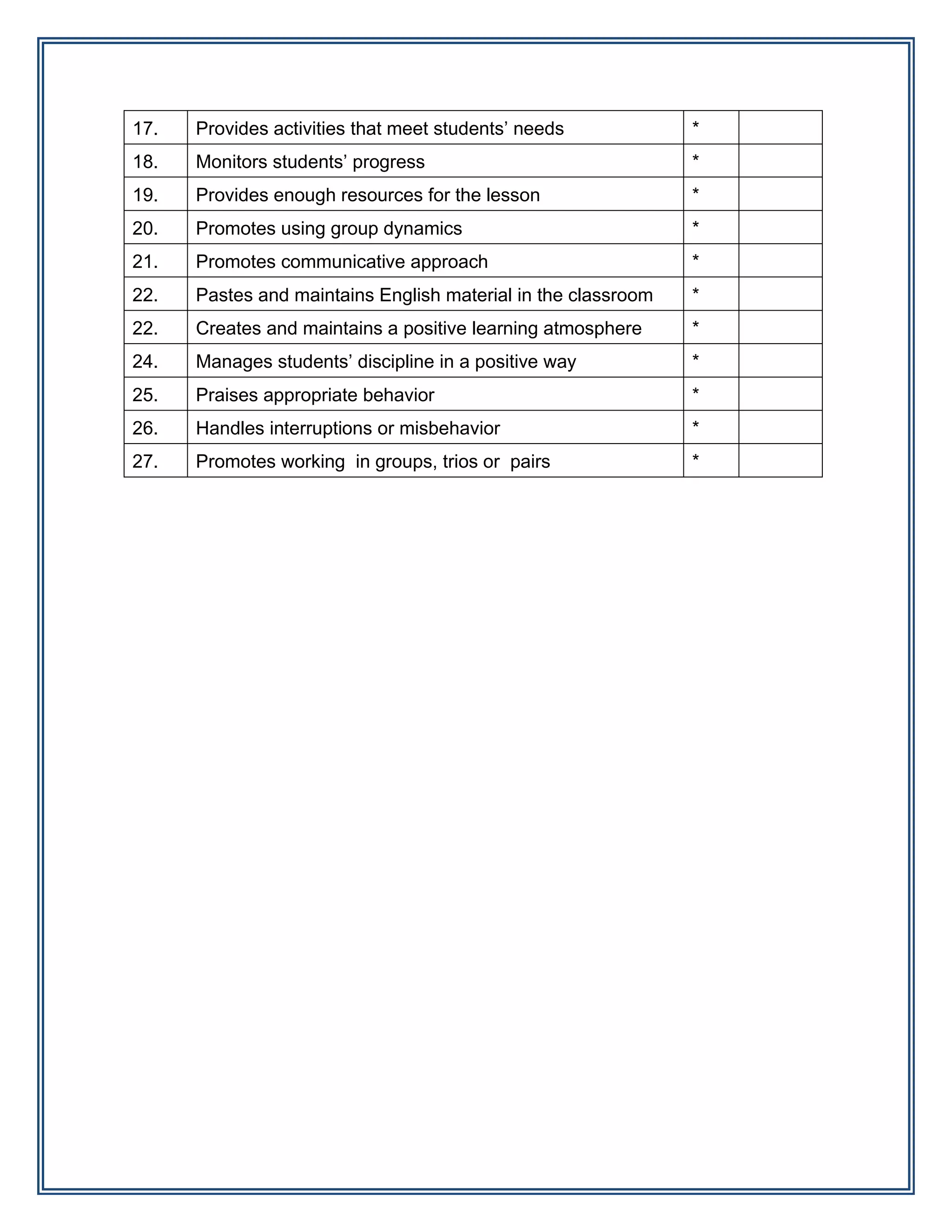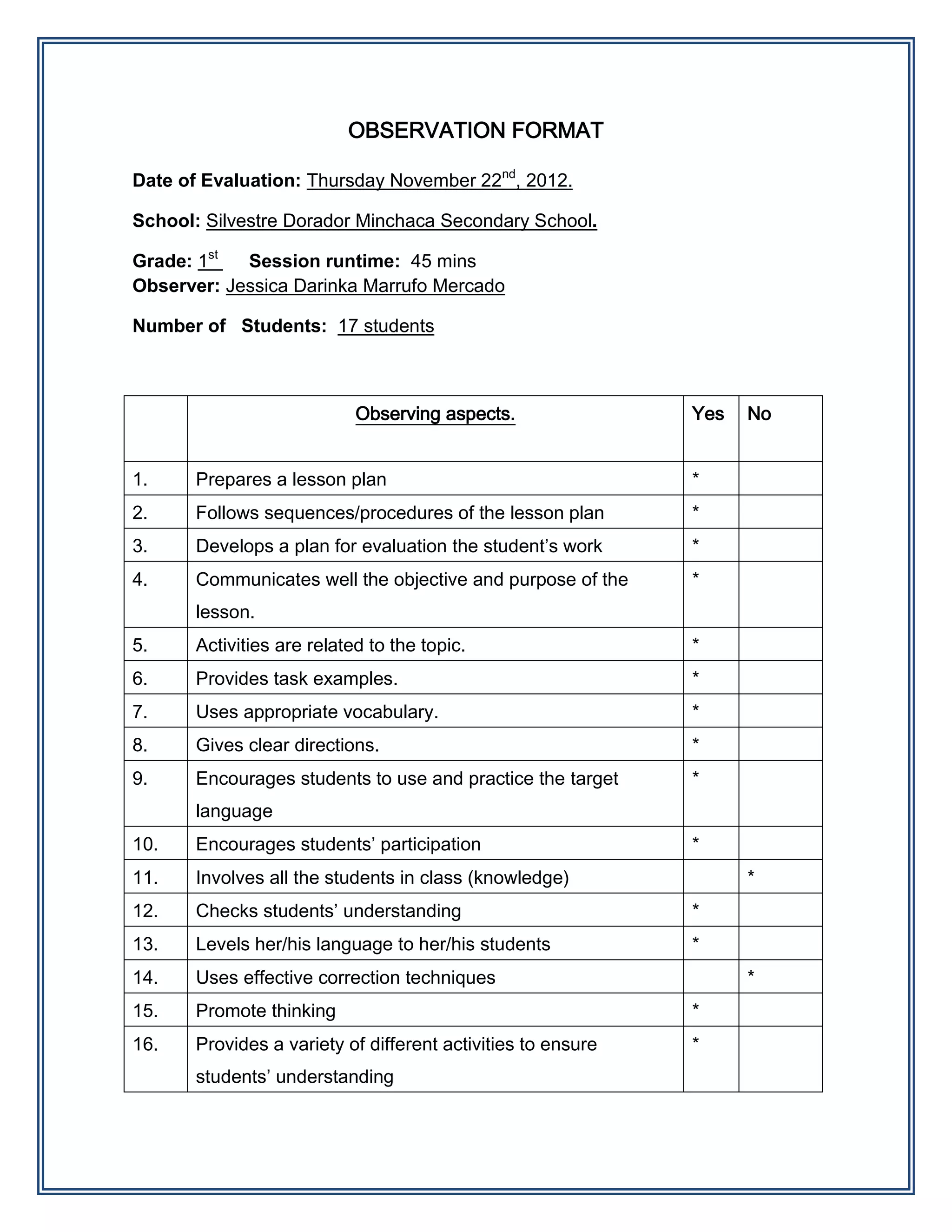 This document summarizes an observation of a 1st grade classroom at Silvestre Dorador Minchaca Secondary School conducted on November 22nd, 2012 by observer Jessica Darinka Marrufo Mercado. The 45 minute session involved 17 students. The observation checklist assessed whether the teacher demonstrated 27 aspects of effective teaching practice, and the teacher received a checkmark for demonstrating each aspect.