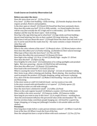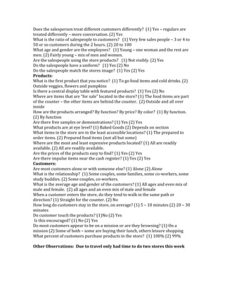 This document summarizes observations from visiting two different stores. For the first store, it was noted that the signage was decent sized but relied on brand recognition. The environment had neutral colors, tile floors, and average lighting that created a homey feel. Employees outnumbered customers and had uniforms. The second store had large clear signage and its name indicated what they sold. It had warm natural colors that reinforced its message, and high ceilings that made it feel big. Music fit the welcoming environment and customers could stay for quick trips or longer visits.