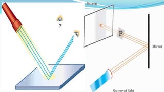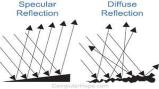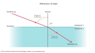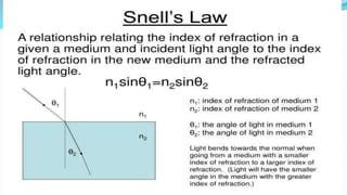 This document summarizes the key concepts of reflection and refraction of light, including definitions and examples. It provides objectives on describing reflection and refraction, calculating index of refraction and angle of incidence. Sample problems are given to calculate angles of incidence and refraction based on the index of refraction. An evaluation section tests understanding with additional practice problems.