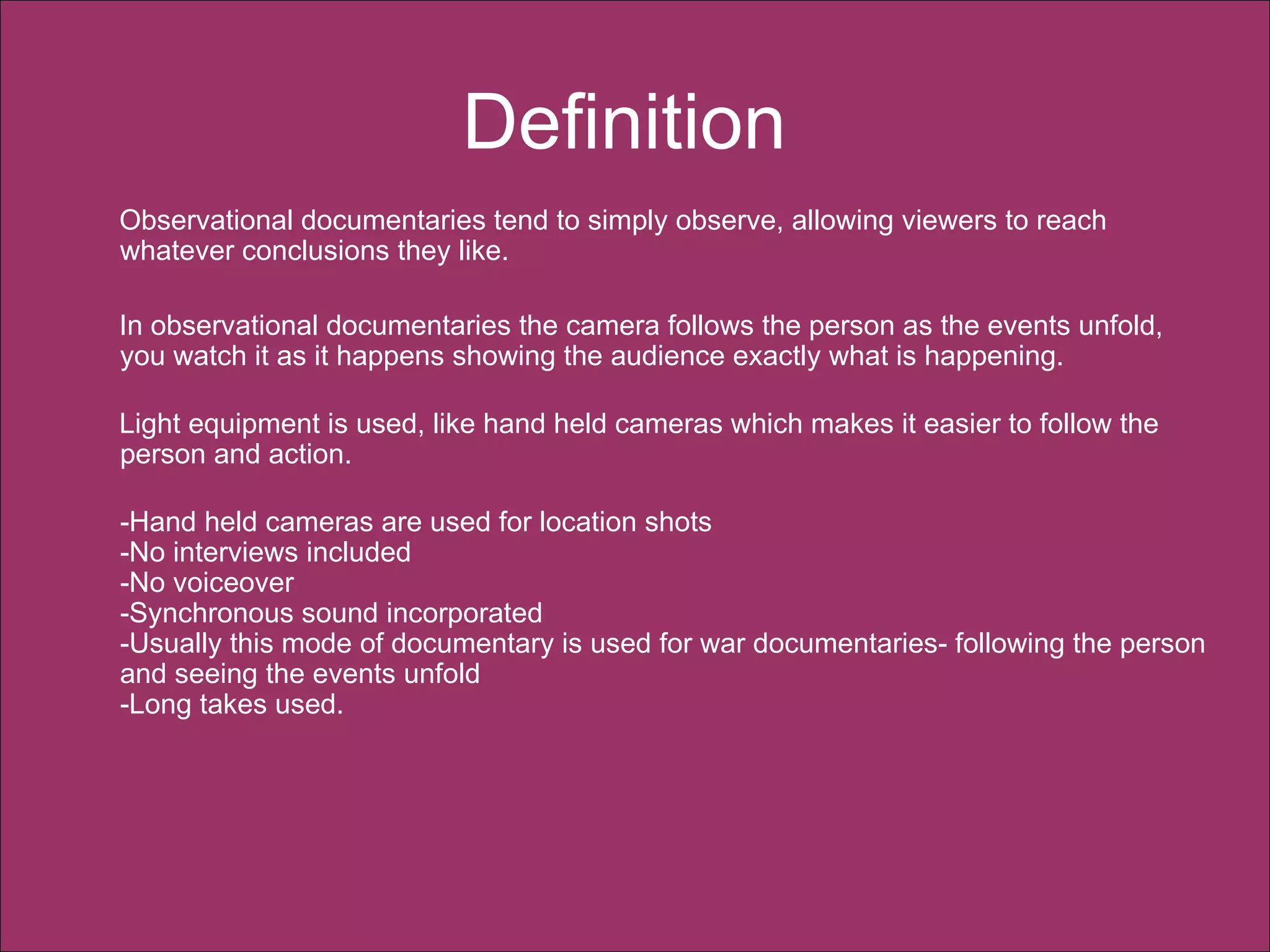 Observational documentaries simply observe subjects without interviews or voiceovers, allowing viewers to form their own conclusions. Light, handheld cameras are used to follow subjects and capture events as they unfold in real-time. Examples include shows that follow celebrities and reality television personalities like Peter Andre, Kerry Katona, and Katie Price in their daily lives without interfering or adding commentary.