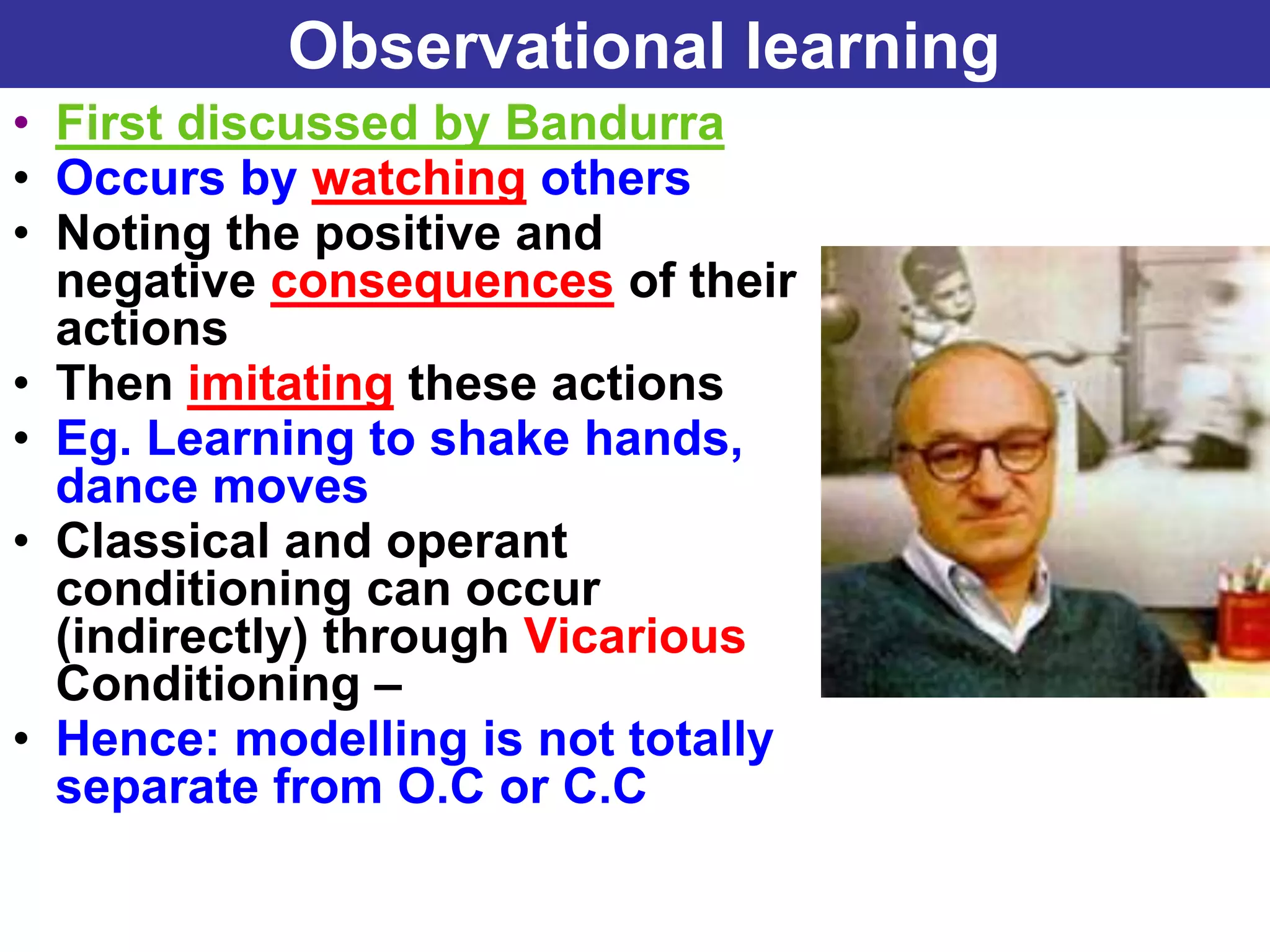 Observational learning, first discussed by Bandura, occurs by watching others and noting the consequences of their actions before imitating them. This process involves five stages: attention, retention, reproduction, motivation, and reinforcement, where one learns indirectly and modifies their behavior based on observations. Key factors influencing attention include the model's status, similarity to the observer, and distinctiveness of behavior.