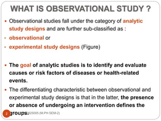 An observational study observes subjects without intervening. A cohort study follows groups over time to compare outcomes based on exposure. This document defines and provides examples of cohort studies. It describes their design, strengths like establishing temporality between exposure and outcome, and ability to study multiple outcomes from one exposure. Examples include Framingham Heart Study, Swiss HIV Cohort Study, and a Danish study on psoriasis and depression.