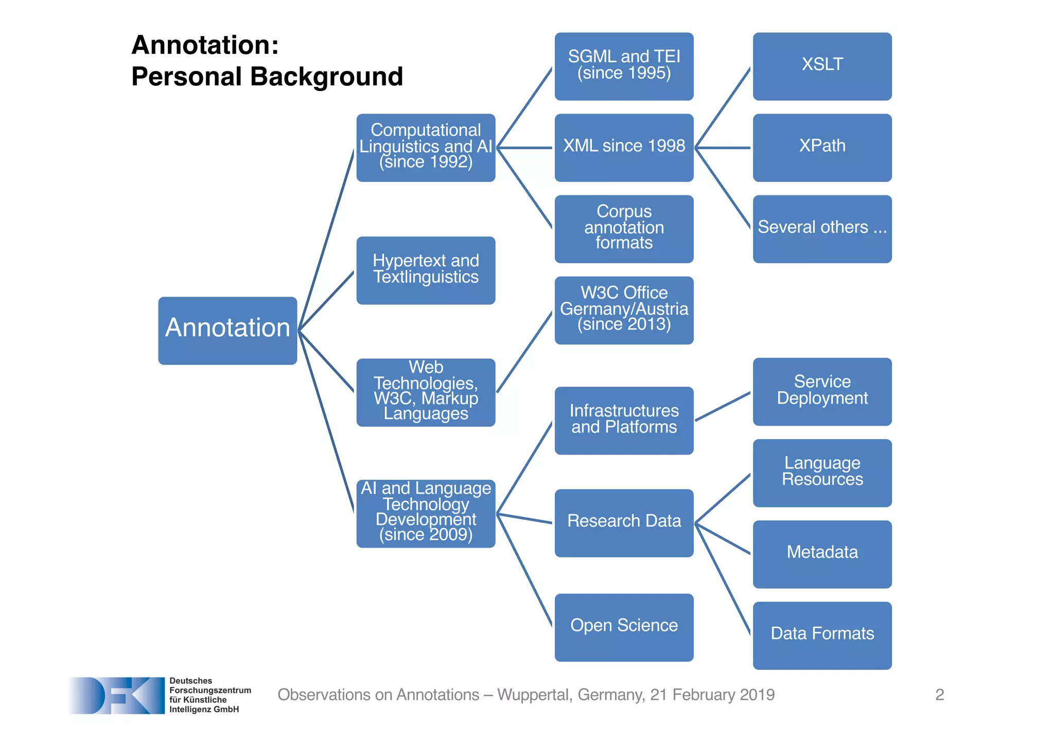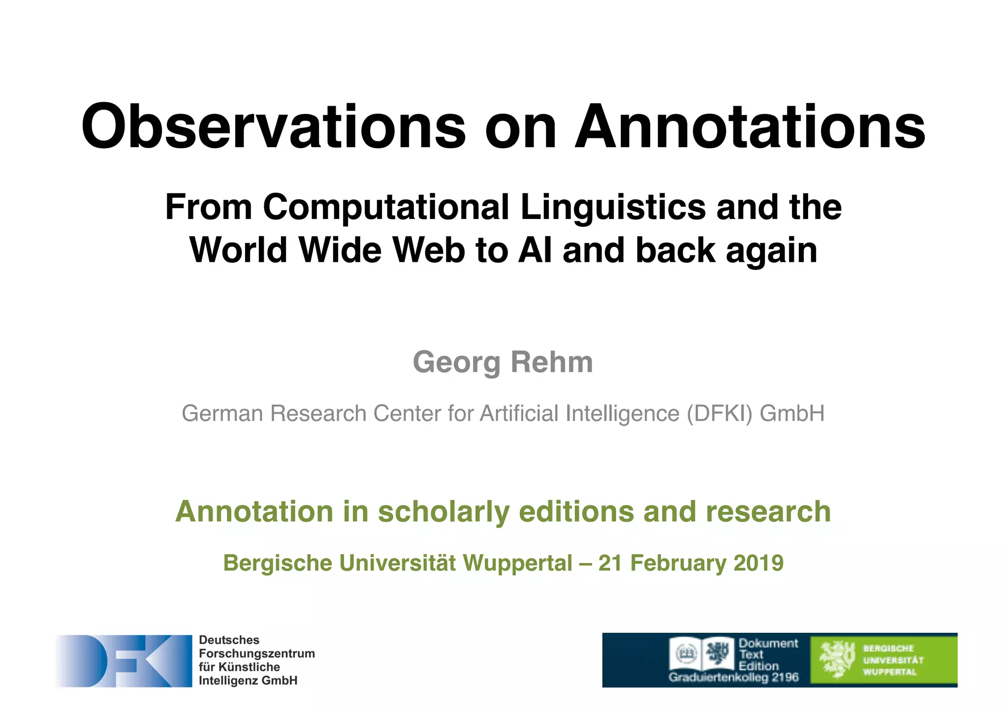 The document presents insights from Georg Rehm's talk at Bergische Universität Wuppertal on annotations in computational linguistics, their significance in AI, and their applications in the context of the web. It discusses various annotation definitions, their historical development, and specific technologies such as the W3C's web annotation standards. Rehm emphasizes the importance of annotations in enhancing research data credibility and the evolving role of AI in leveraging annotated datasets.