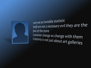 It notes how stores cram products and force branding on customers rather than listening to what people really want. The document suggests making shopping a more sensory and exciting experience by using color, sounds, and a knowledgeable staff in order to attract and retain customers rather than relying on apathy. It encourages corporations to try new unproven approaches and making stores feel more welcoming and less like cold warehouses.