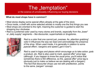 This document discusses common techniques used in retail store design and product placement to subtly influence customer purchases and shopping behavior. Some key points made: