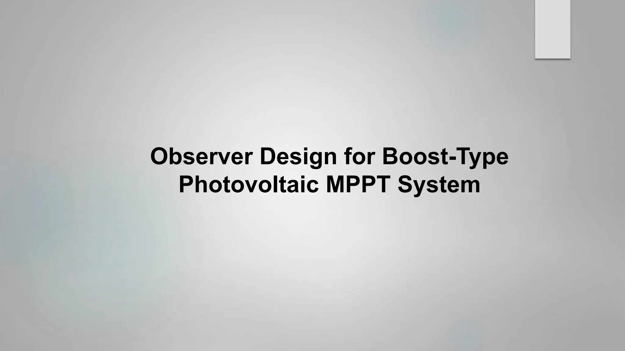 The document reviews various studies on proportional integral observers (PIO) and their application in boost-type photovoltaic maximum power point tracking (MPPT) systems. It discusses the design and implementation of P and PIO observers for state estimation in DC-DC converters and compares different MPPT techniques such as perturb and observe (P&O) and incremental conductance (Inc). Furthermore, it highlights the importance of accurate state estimation for feedback control in power systems and concludes with proposed improvements for future research.