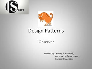 The document discusses the observer design pattern, which defines a one-to-many dependency between objects so that when one object changes state, all its dependent objects are notified automatically. It describes observers registering with providers to receive notifications of predefined events or state changes. When such an event occurs, the provider notifies all observers by calling one of their methods and can provide current state information. Real-life examples of auctions are provided, where bidders observe changes in bid price. Implementation in .NET using IObservable and IObserver interfaces is also summarized.