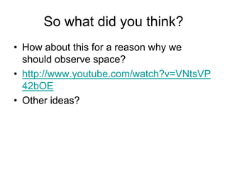 The document discusses observing objects in space using telescopes. It begins by asking why we would want to observe space and provides a video link with possible reasons. It then describes how telescopes have developed over the years from early pirate telescopes to large modern ground and space-based telescopes like Hubble. Factors that control the effectiveness of ground telescopes are discussed. The best locations for large ground telescopes are analyzed based on latitude, population density, altitude and other factors. Finally, the document provides information about the Hubble space telescope, including how it works and examples of images it has captured.