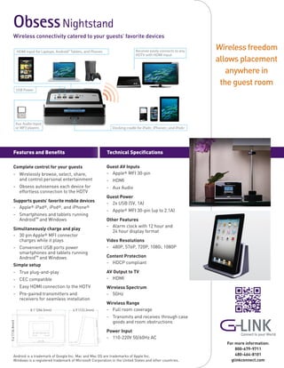 The Obsess Nightstand allows guests to wirelessly share movies, music, and games from their mobile devices to the guest room TV. It features a docking station to charge devices while playing content on the big screen. Guests have freedom and control to browse and select entertainment from the comfort of their bed. The simple plug-and-play setup seamlessly connects devices to the TV for a memorable experience.