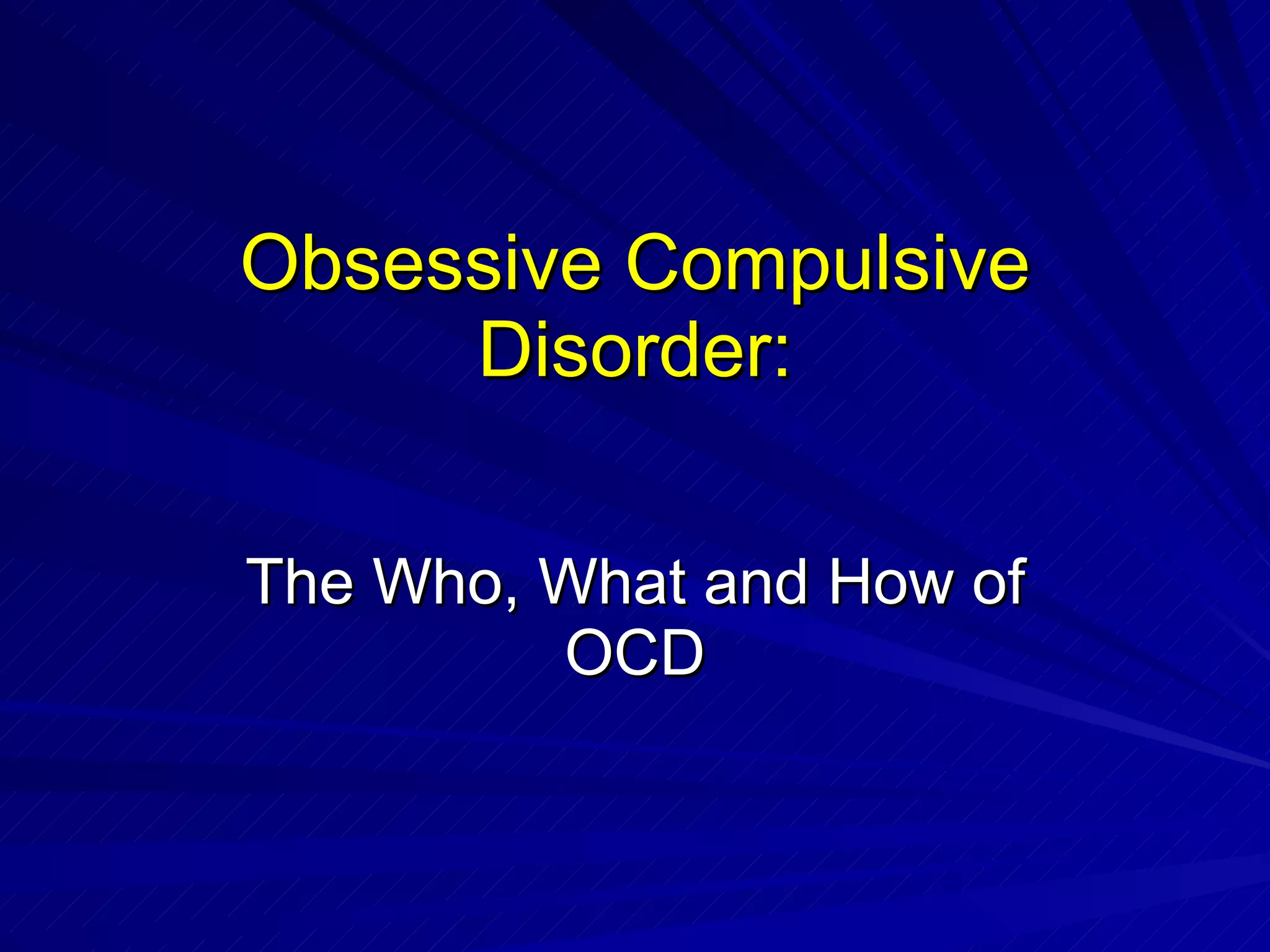 This document summarizes obsessive compulsive disorder (OCD), including who can develop it, common symptoms, potential causes, and treatments. OCD affects approximately 3% of Americans and can develop in teens and adults, causing obsessions and compulsions. Common obsessions include fears of germs, harming others, unwanted thoughts, and need for order. Compulsions like handwashing, praying, or counting alleviate anxiety. Potential causes include abnormalities in brain regions like the basal ganglia and cingulum, as well as genetic and chemical factors. Cognitive behavioral therapy and medication are effective treatments, but many suffer for years without proper diagnosis and support.