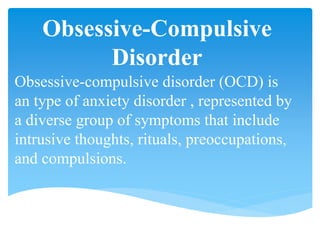Obsessive-Compulsive Disorder (OCD) is an anxiety disorder characterized by intrusive thoughts and compulsive behaviors that cause significant distress and impact daily functioning. The condition affects an estimated 2-3% of the population and often co-occurs with other mental health disorders, such as major depression and anxiety. Treatment typically involves a combination of pharmacotherapy, primarily SSRIs, and cognitive-behavioral therapy, with more severe cases sometimes resolved through surgical options.