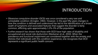Obsessive compulsive disorder (OCD) is a mental illness characterized by repetitive unwanted thoughts (obsessions) and behaviors (compulsions) that are difficult to control. It is caused by genetic and neurological factors and affects 1.2-3% of the population. OCD is classified into types based on the content of obsessions and nature of compulsions, such as contamination fears/washing rituals. Treatment involves cognitive behavioral therapy and medication like SSRIs, with some FDA approved for children. More research is still needed to improve treatment outcomes for what can be a chronic and disabling condition.
