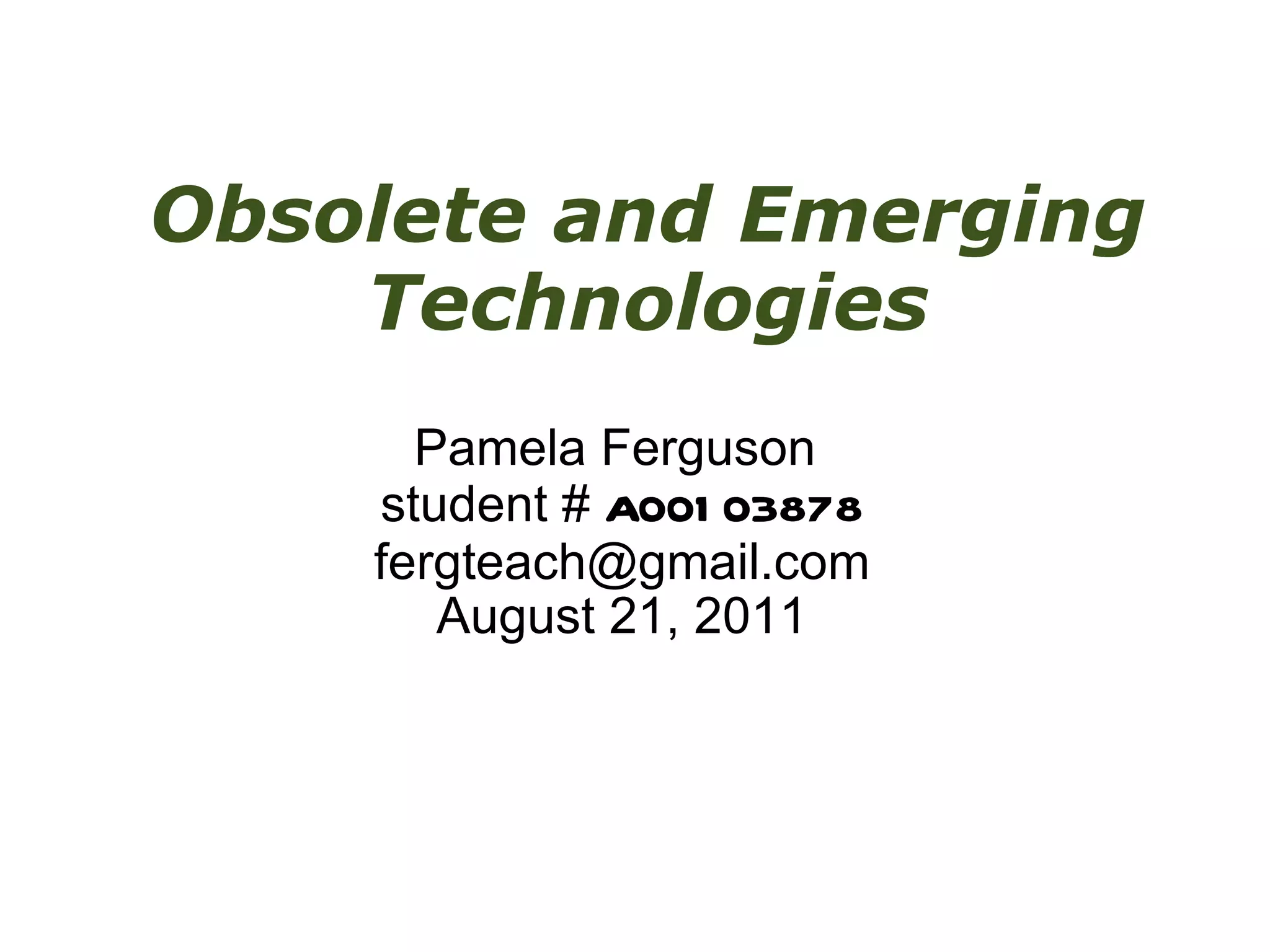 The document discusses six forces that drive emerging technology: evolutionary technologies, rhymes of history, disruptive technologies, science fiction, increasing returns, and red queens. It analyzes how technologies like laserdiscs, DVDs, and streaming media fit within these categories. The document predicts that streaming media will replace many current visual media delivery methods and that in the future, entire walls may display multiple streaming contents without computers or wires. It concludes with a quote about change being the only constant.