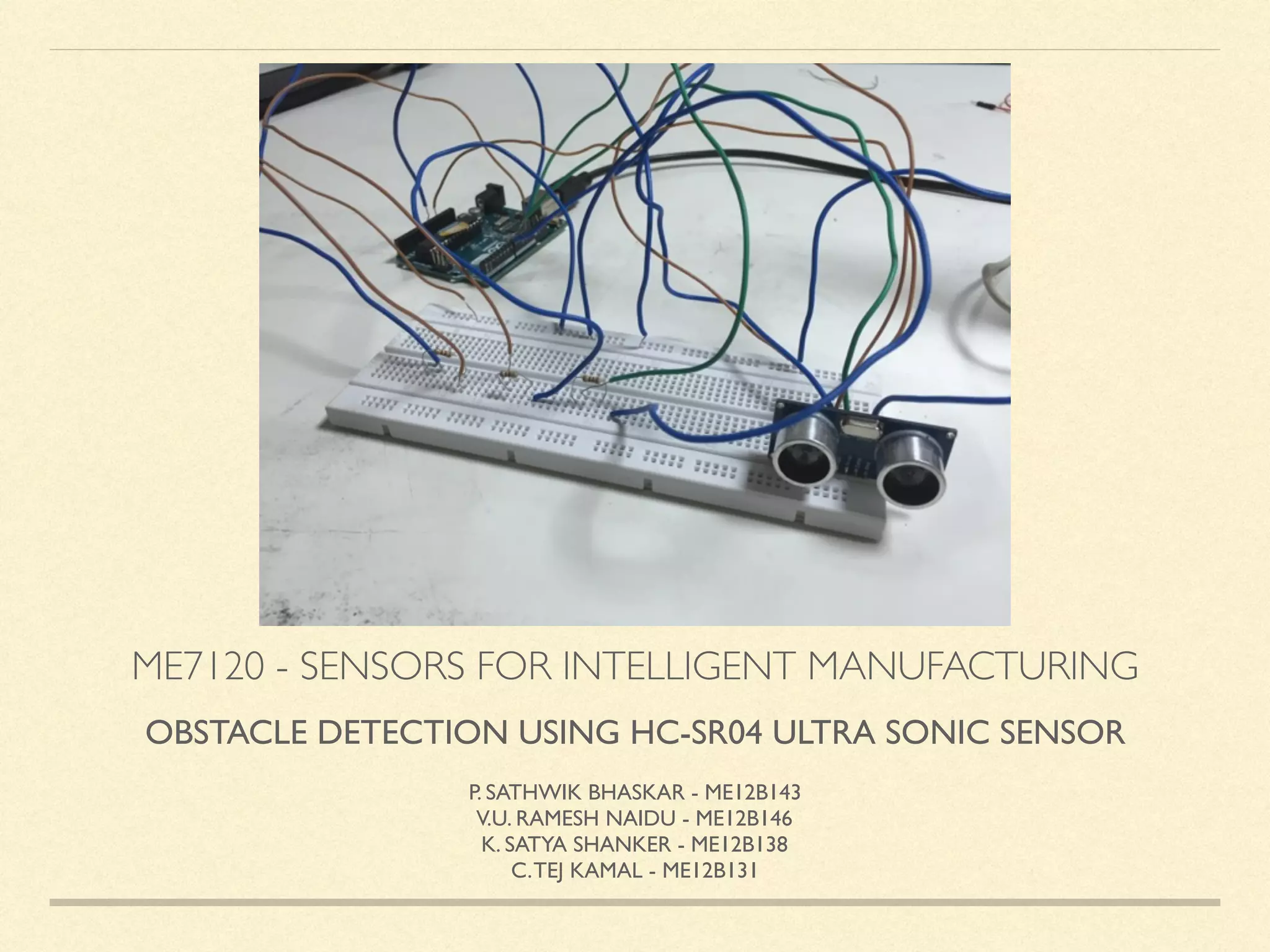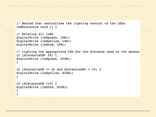 The document summarizes the working principles and applications of ultrasonic sensors, specifically the HC-SR04 sensor. It describes how ultrasonic sensors use piezoelectric materials to generate and detect sound waves to measure the distance to targets. The HC-SR04 sensor can detect objects from 2cm to 400cm away and is unaffected by light or dark surfaces. Its operation involves transmitting ultrasonic pulses and measuring the echo return time to determine distance. Common applications of ultrasonic sensors include obstacle detection, motion sensing, and liquid level measurement.