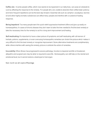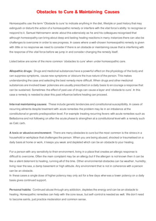 Obstacles to Cure & Maintaining Causes discusses potential hindrances to the effectiveness of homeopathic remedies. Some obstacles include allopathic drugs, internal maintaining causes like genetic tendencies, and toxic or abusive environments. Personal habits like addiction and impatience can also interfere with healing responses to remedies. Coffee, essential oils, self-medicating, and assuming incurability too quickly are other potential obstacles to cure outlined in the document.