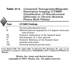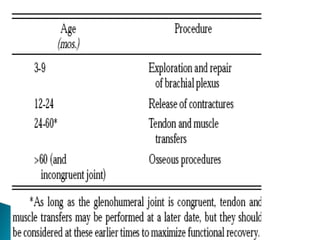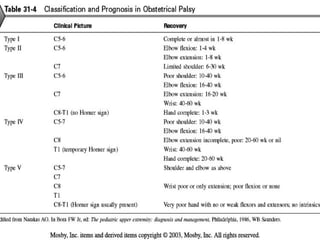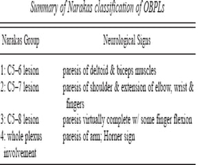 This document discusses obstetric brachial plexus palsy (OBPP), including its causes, presentation, evaluation, treatment, and long-term management. It notes that OBPP is caused by stretching or avulsion of the brachial plexus nerves during childbirth. Clinical assessment focuses on determining the specific roots involved and severity of injury. Management involves initial physiotherapy followed by surgical repair or reconstruction if needed to address nerve injuries or resulting musculoskeletal deformities. The goal is to restore function and prevent long-term complications through a multidisciplinary approach.