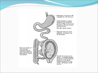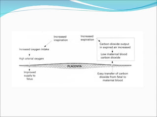 The document discusses various physiological changes that occur in the maternal body during pregnancy. It covers changes in the respiratory, cardiovascular and circulatory systems. Respiration rate increases leading to higher minute ventilation to support gas exchange. Cardiac output increases significantly due to rises in both heart rate and stroke volume. Blood volume expands substantially to support increased organ perfusion and uterine blood flow.