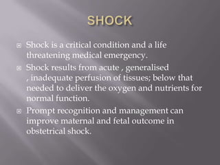 This document discusses obstetric shock, its causes, signs, stages, and management. Shock is a life-threatening medical emergency characterized by inadequate tissue perfusion and oxygenation. The major causes of obstetric shock are hemorrhage, sepsis, cardiogenic issues, neurogenic issues, and anaphylaxis. Untreated shock progresses through compensated, decompensated, and irreversible stages. Initial management focuses on airway, breathing, circulation, oxygenation, intravenous fluids, blood transfusion, and identifying and treating the underlying cause. Prompt recognition and treatment of obstetric shock can improve maternal and fetal outcomes.