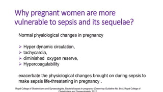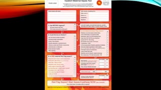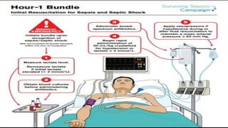 Dr. Niranjan Chavan presented on an obstetrics sepsis bundle approach. Maternal sepsis is a leading cause of maternal mortality worldwide. Early screening and treatment is key to managing sepsis. The sepsis bundle approach involves completing 6 tasks within 1 hour of diagnosis: administering oxygen, collecting cultures, giving antibiotics, fluid resuscitation, measuring lactate levels, and monitoring urine output. Additional treatment may include source control, vasopressors, corticosteroids, DVT prophylaxis, and determining whether delivery is necessary based on maternal and fetal status. With rapid identification and treatment, the sepsis bundle approach can help reduce mortality from this life-threatening condition.