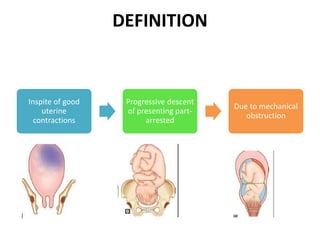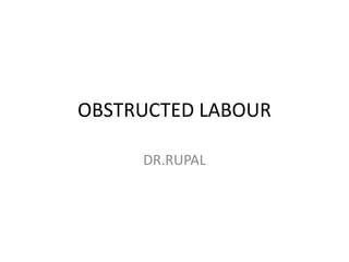 This document discusses obstructed labor, defined as arrested progression of the presenting fetal part during labor due to mechanical obstruction. Causes include faults in the pelvic passageway or fetus. Anatomical changes in the mother include pathological retraction rings and trauma to organs. Effects on the mother are immediate like exhaustion, infection, and hemorrhage or remote like fistulas. The fetus is at risk of asphyxia, infection, and acidosis. Clinical features include continuous pain, exhaustion, tender abdomen, and swollen vagina. Prevention focuses on antenatal detection and timely intervention in prolonged labor. Treatment principles are to relieve the obstruction, combat dehydration and infection, and control sepsis through fluid resuscitation, antibiotics,