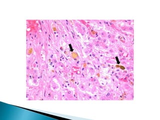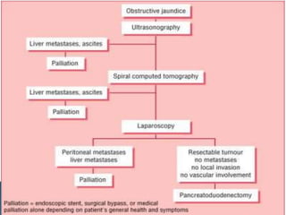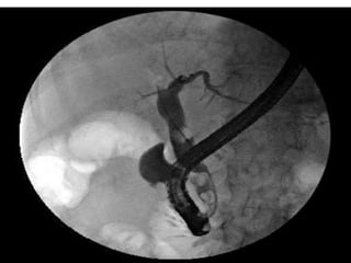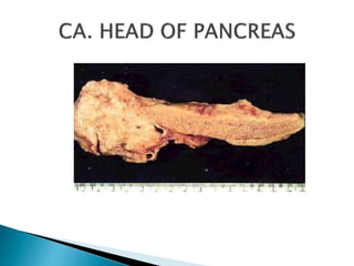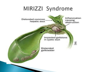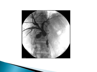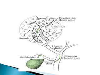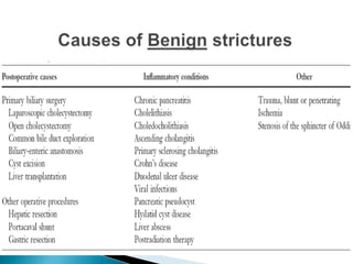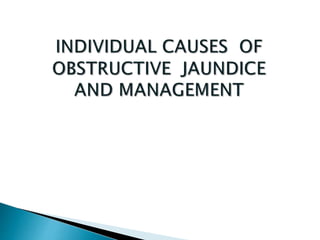 This document provides information about jaundice and obstruction of the biliary tract. It begins with an overview of the causes of yellow discoloration of the skin and mucous membranes, which is caused by bilirubin accumulation. It then describes the breakdown of red blood cells and how bilirubin is processed and excreted. The document outlines various causes of obstructive jaundice including gallstones, strictures, tumors, and external compression. Investigation methods and treatment approaches for different biliary obstructions are also summarized.