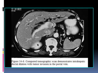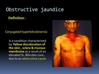 This document discusses obstructive jaundice, including its definition, classification, pathophysiology, signs and symptoms, investigations, and treatment. It covers four main types of obstructive jaundice - complete obstruction, intermittent obstruction, chronic incomplete obstruction, and segmental obstruction. Causes discussed include CBD stones, tumors, strictures, cysts, and parasites. The role of radiology, biomarkers, and surgery in evaluating and managing obstructive jaundice is also summarized.