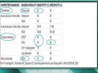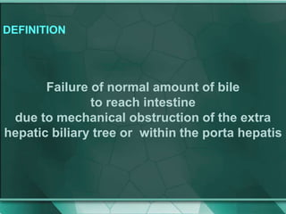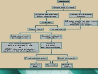 This document discusses obstructive jaundice, providing definitions, pathophysiology, effects on various body systems, etiology, history and examination findings, laboratory investigations, imaging modalities, and causes of biliary obstruction. It defines obstructive jaundice as a failure of bile to reach the intestine due to mechanical obstruction. Pathophysiological changes include bile duct dilation, hepatic fibrosis, and portal hypertension. Causes include gallstones, strictures, tumors, and congenital anomalies. A thorough history, physical exam, and lab tests can localize the level and cause of obstruction, while imaging modalities like ultrasound and MRCP can identify and characterize obstructive lesions.