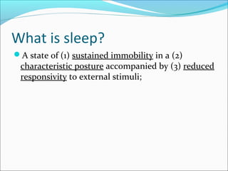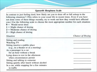 The document provides an extensive overview of sleep, detailing its stages, biological rhythms, and the importance of sleep for health. It discusses sleep disorders, particularly obstructive sleep apnea (OSA), its prevalence, risk factors, symptoms, and diagnosis methods, as well as available treatments including behavioral changes, medical therapies, and surgical options. Additionally, it highlights the cardiovascular risks associated with OSA and the impact of sleep disorders on overall well-being.
