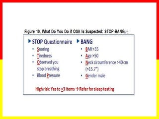 Diagnosis  The diagnosticprocess is guided by understanding who to screen or refer for polysomnography (PSG).  The STOP-BANG inventory is a simple, office- based screening tool that combines symptoms, historical information, and physical examination results to recognize individuals at high risk of OSA. 10 0