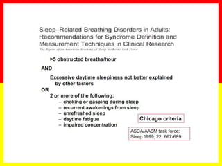 A. At leastone of the following applies: 1. The patient complains of unintentional sleep episodes during wakefulness, daytime sleepiness, unrefreshing sleep, fatigue, or insomnia. 2. The patient wakes holding his/her breath, gasping, or choking. 3. The bed partner reports loud snoring or breathing interruptions during the patient's sleep. B. Polysomnographic recording shows the following: 1. Five or more scoreable respiratory events occur per hour. These events can include any combination of obstructive apneas, hypopneas, or respiratory-associated arousals. 2. There is evidence of respiratory effort during all or a portion of each respiratory event. C. This disorder is not better explained by another sleep, medical, or psychiatric disorder, substance abuse, or medication. D. Associated features: snoring, obesity, systemic hypertension, pulmonary hypertension, congestive heart failure, sleep fragmentation, recurrent awakening from sleep, sleep-related cardiac dysrhythmias, nocturnal anginaM gastroesophageal reflux, impaired quality of life, impaired concentration, diabetes, metabolic syndrome The individual must fulfill A, B, and C AASM International Classification, 2005 Diagnostic Criteria for OSAHS