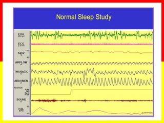 Polysomnography  EOG -Electrooculogram  EEG - Electroencephalogram  EMG - Electromyogram  ECG - Electrocardiogram  Tracheal noise  Nasal and oral airflow  Thoracic and abdominal respiratory effort  Pulse oximetry