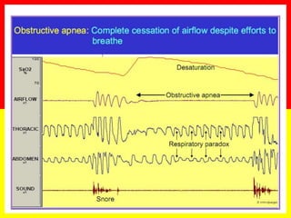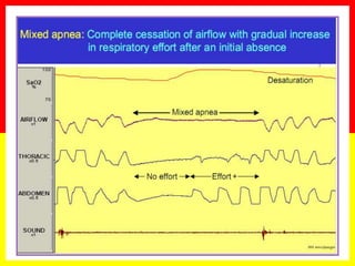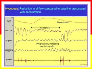  Breathing ismonitored, including airflow at the nose and mouth (using both a thermal sensor and a nasal pressure transducer), effort (using inductance plethysmography), and oxygen saturation  The breathing pattern is analyzed for the presence of apneas and hypopneas 11 4 AASM standards and guidelines for diagnostic polysomnography
