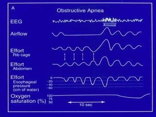 Standard Polysomnography  EEG,EOG, EMG  ECG  Airflow  Chest/abd, bands  Pulse oximetry  Left/right leg EMG Presence/stage of sleep Cardiac rate/rhythm Apnea/hypopnea Respiratory effort Arterial oxygen sat Leg movements (PLMs)