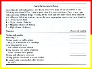  Patients needto be specifically asked about the presence of daytime sleepiness.  They often don’t recognize they are sleepy since the problem has been present for a prolonged period of time and they have changed their lifestyles gradually to compensate for it. 88
