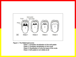  On average,the risk of OSA increases more than two-fold for every 1-point increase in the Mallampati Scale: a Mallampati IV patient has an eight-fold risk of OSA.  Such a strong association suggests that if a high Mallampati score is noted during a routine examination, inquiring further about snoring and ES symptoms may be warranted 96